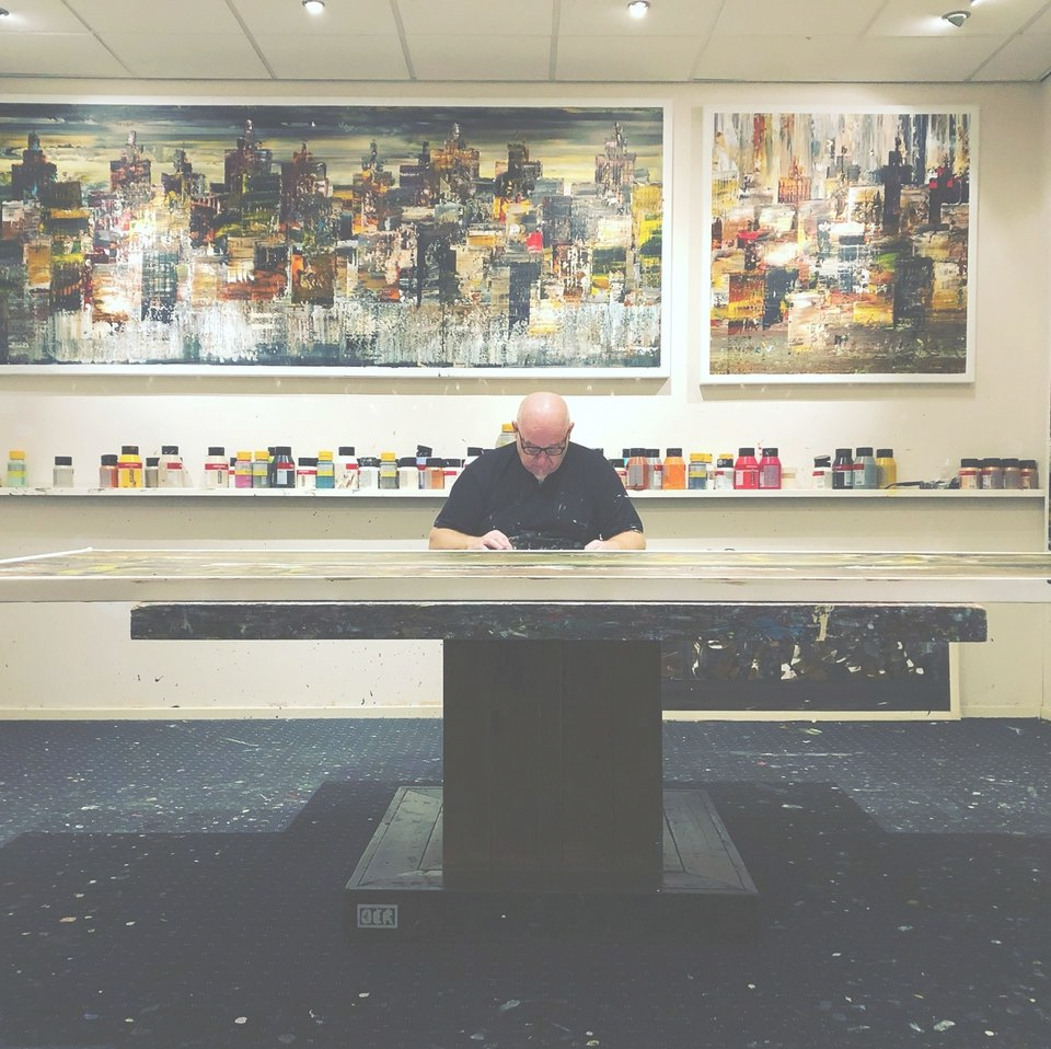 Gerrit werkt abstract met acryl op linnen en deze zijn voorzien van een aluminium frame. Hij gebruikt veel verf en werkt laag over laag, hierdoor krijgen zijn doeken diepte en reliëf waardoor het schilderij gaat leven en de kleuren van het doek spatten. De formaten waar hij veel op werkt zijn groot, enkele voorbeelden zijn 250x100cm, 180x180cm, 150x250 of 300x100cm. Al het werk van Gerrit hangt of staat in de galerie, de keuze hierin is reuze. Zo zit er altijd wel iets tussen wat u aanspreekt. Op de website vindt u een overzicht van een aantal schilderijen, zo kunt u een indruk krijgen van wat er allemaal in de galerie hangt. Voor de nieuwste werken verwijs ik u naar onze Instagram pagina onderaan deze website.